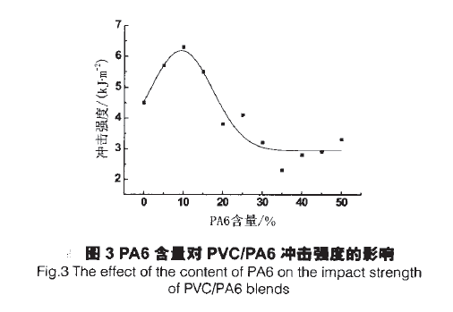 圖3是PVC/PA6共混物的缺IZl沖擊強(qiáng)度曲線。從圖3可以看出,對于不同配比的PVC/PA6共混物,隨著PA6含量的增加,其沖擊強(qiáng)度整體上先上升再下降較后趨于平緩。當(dāng)PA6含量少于10% 時(shí),PVC/PA6共混物的沖擊強(qiáng)度隨著PA6含量的增加而升高;當(dāng)PA6含量為10%時(shí),PVC/PA6共混物的沖擊強(qiáng)度達(dá)到較大值,為6.29kJ/m ,是純PVC的1.39倍;當(dāng)PA6含量超過10% 時(shí),PVC/PA6共混物的沖擊強(qiáng)度隨著PA6含量的增加而降低,PA6含量為30% 時(shí),共混物沖擊強(qiáng)度降到較低,甚至低于純PVC的沖擊強(qiáng)度,約為3.5 kJ/m 。這是由于EVA—g-MAH與PA6在共混物中的配比(1/4)固定,隨著PA6含量的增加,EVA—g—MAH的含量也相應(yīng)增加,EVA—g.MAH與PVC中的 氫形成氫鍵作用,隨著EVA—g—MAH含量的增加,共混物中的分子問氫鍵也有所增加,大量氫鍵的生成導(dǎo)致共混物的沖擊性能下降。當(dāng)PA6含量超過30% ,隨著PA6含量的增加,PVC/PA6共混物的沖擊強(qiáng)度變化不大。PA6含量少于30% 時(shí),PVC/PA6的缺口沖擊強(qiáng)度主要是與共混物的微觀結(jié)構(gòu)有關(guān)。結(jié)合圖1可知,PVC/PA6的沖擊強(qiáng)度較高點(diǎn)對應(yīng)著分散相分散尺寸為1gm的共混物,當(dāng)PA6含量大于10~/0后,PA6在PVC/PA6共混物中的分散尺寸增大,與其相對應(yīng)的共混物的沖擊強(qiáng)度也呈下降趨勢。另外,結(jié)合圖2可知,影響PVC/PA6共混物沖擊強(qiáng)度的主要微觀因素是分散相的分散狀態(tài)結(jié)構(gòu)。