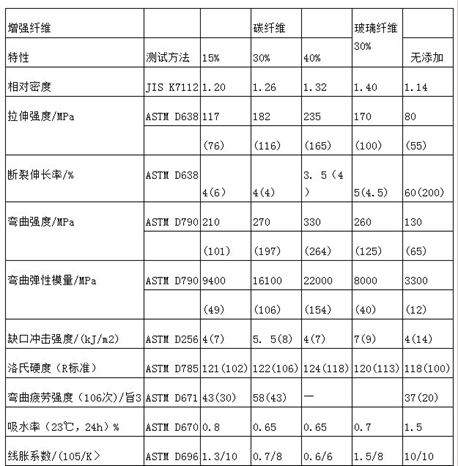 根據(jù)碳纖維長度、表面處理方式及用量的不同,還可以制備綜合性能優(yōu)異、導電性能各異的導電材料,如抗靜電材料、電磁屏蔽材料、面狀發(fā)熱體材料、電極材料等。碳纖維增強尼龍材料近年來發(fā)展很快,因為尼龍和碳纖維都是各自領(lǐng)域性能優(yōu)異的材料,其復合材料綜合體現(xiàn)了二者的優(yōu)越性,強度與剛性比未增強的尼龍高很多,高溫蠕變小,熱穩(wěn)定性顯著提高,尺寸精度好,耐磨,阻尼性優(yōu)良,與玻纖增強尼龍相比有更好的綜合性能,如表所示。
