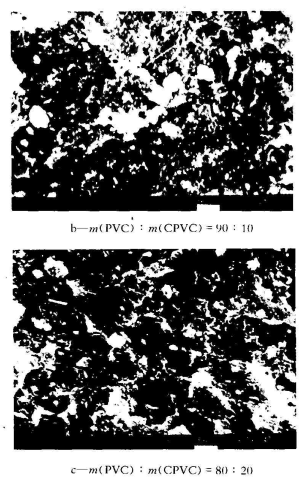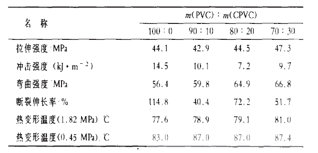 結(jié)果表明,在有機(jī)錫穩(wěn)定劑的作用下,當(dāng) (PVC): (CPVC)從1O0:0向70:30變化時(shí),隨著CPVC含量的增多,pvc/CPVC二元合金體系的拉伸強(qiáng)度、沖擊強(qiáng)度、斷裂伸長(zhǎng)率均呈現(xiàn)先下降后上升的趨勢(shì);而彎曲強(qiáng)度卻與之相反,出現(xiàn)先上升后下降的趨勢(shì)。兩種趨勢(shì)在(PVC):(CPVC)=80:20時(shí)出現(xiàn)拐點(diǎn),此時(shí)體系的沖擊強(qiáng)度和斷裂伸長(zhǎng)率都下降到單用PVC時(shí)的50% ,拉伸強(qiáng)度也只有原來的93%,而彎曲強(qiáng)度卻提高了5%。除此之外,隨著共混比中CPVC含量的增加,體系的熱變形溫度不斷升高,(PVC):(CPVC)=70:30時(shí),在不同彎曲正應(yīng)力(1.82MPa和0.45 MPa)下,熱變形溫度較PVC分別增加1.3 ℃ 和5.6℃。