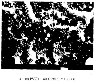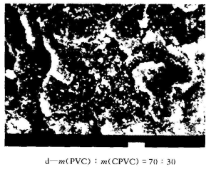 圖1是 (PVC): (CPVC)=1O0:0、90:10、80:20、70:30時(shí),合金沖擊試樣斷面放大1 500倍的SEM 照片。由圖1可以看出,PVC/CPVC合金的相容性較好,這與文獻(xiàn)報(bào)道的相同。相比較而言,(PVC): (CPVC)=90:10、80:20時(shí),體系的分散效果稍差.合金體系中出現(xiàn)了顆粒的大小和分散不均勻的現(xiàn)象。但隨著CPVC用量的增加,合金體系均一性大大改善,尤其是當(dāng) (PVC): (CPVC)=70:30時(shí),兩者的分散性更加均勻。