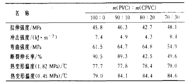 實(shí)驗(yàn)中較早先選擇鉛鹽穩(wěn)定劑,探討共混比對(duì)PVC/CPVC二元合金性能的影響,結(jié)果見表1。