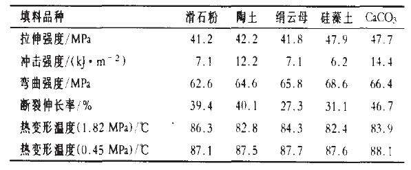 從表3可以看出:PVC/CPVC合金體系的拉伸強(qiáng)度以選用硅藻土和活性CaCO3時(shí)較大,分別為47.9MPa和47.7 MPa,沖擊強(qiáng)度則是選用活性CaCO~和陶土?xí)r較大,分別為14.4 kJ/m2和12.2 kJ/m2。在采用活性CaCO3時(shí),試樣的斷裂伸長(zhǎng)率也達(dá)到較大,為46.7%。由于填料的使用量小,填料品種對(duì)PVC/CPVC合金體系的彎曲強(qiáng)度和熱變形溫度影響不大。