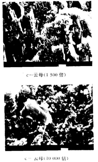 2.4 不同填料品種的PVC/CPVC合金沖擊試樣斷面的形貌在鉛鹽穩(wěn)定劑的作用下,m(PVC):m(CPVC)=70:30選用B一564為沖擊改性劑,觀察加入滑石粉、陶土、云母、硅土、CaCO,等不同填料的PVC/CPVC合金體系在電子掃描電鏡下的微觀結(jié)構(gòu)。